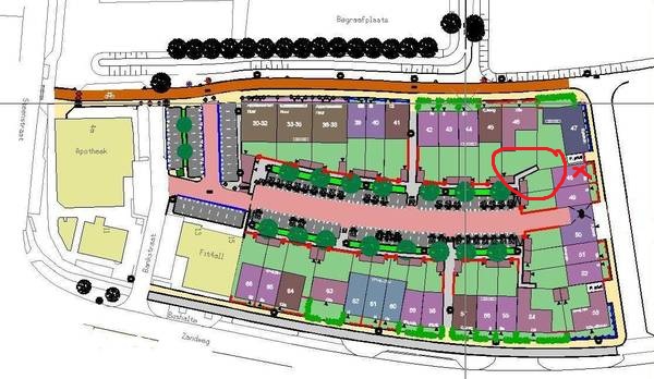 Kuisje wonen wij. Omcircelt is de brandgang.
