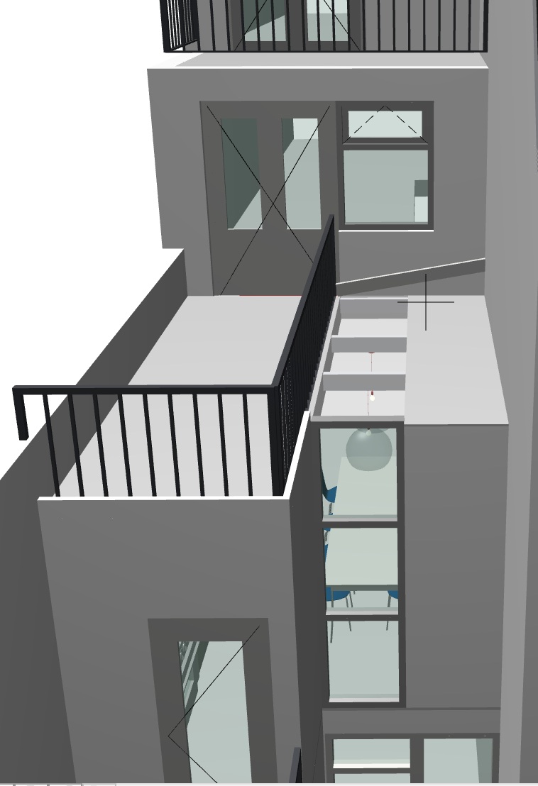 Voor een opdrachtgever in Utrecht wilen wij een aanbouw op de eerste verdieping tekenen. De aanbouw komt tussen de buren en een eerder aangebouwde keuken. ahw zetten we het kleine zijterrasje/patio dicht en vegroten de woonmaker/keuken. We wilden een compleet glazen dak en pui voorstellen. Maar nu hebben we bedacht om de zijkant grenzend aan de buren voor de eerste meter dicht te laten. Er blijft dan een strookje (snede) daklicht en pui over tussen de huidige keuken en het dichte deel.