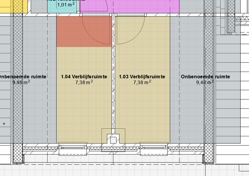 In de bijlage is zie je de situatie. In eerste instantie ben ik uitgegaan dat VR 1.03 en 1.04 beide van voorgevel tot scheidingsmuur liepen, maar dan kom ik niet uit. Is het toegestaan om het VR en VG te verkleinen zoals aangegeven met het rode vlak? Dan bevindt er zich geen toegangsdeur in de VR en het VG. Niet dat ik ergens gezien heb dat het niet mag, maar ik zoek bevestiging.