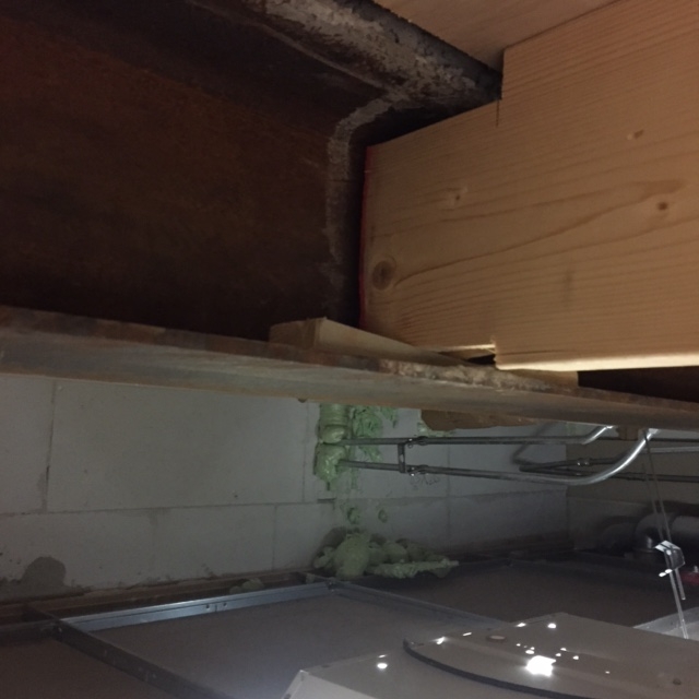 Waar mijn keuken zich bevind is een platdak met dakterras. Het constructie hiervan is gemaakt uit latijen. Begin 2014 begon deze constructie het te begeven en nu heeft de eigenaar van het pand het langs binnen laten opvangen door houtenbalken en plaat materiaal. Het oude constructie wat het begeeft is niet verwijderd maar rust op deze nieuwe constructie. Een tussen muur waar de balken op gemonteerd zijn is een muur van Ytong blokken en niet helemaal door getrokken. Hier en daar zijn er houten wiggen tussen geslaan om de balken op hun plaats te houden.
