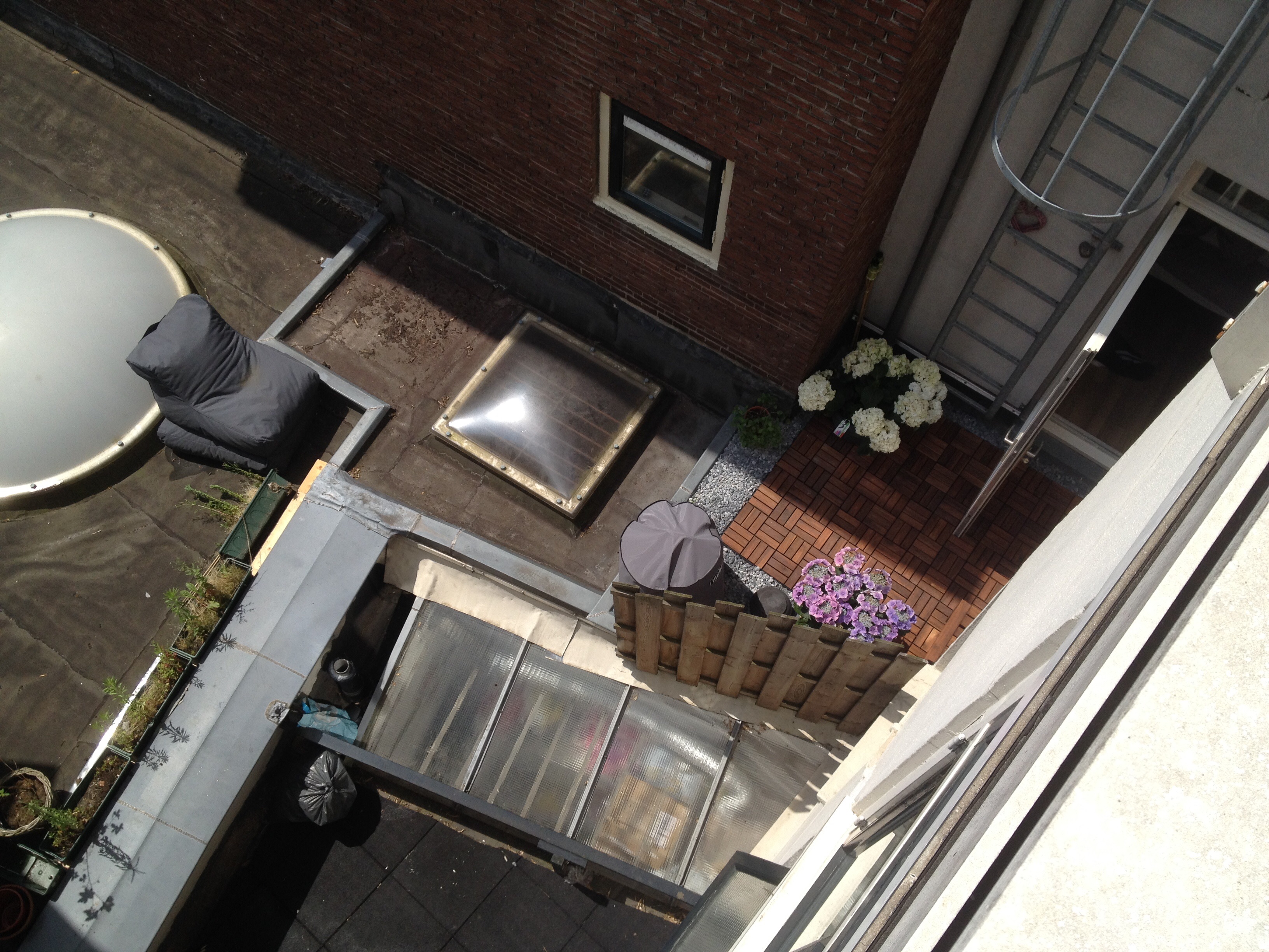 Ik heb een vraag. Ik heb een dakterras dat aan de zijkant overgaat in dakraam van onze onderburen. Het raam bevat draadglas. Er zit verder geen bescherming tussen ons terras en dat raam. Onlangs is een van mijn familieleden tegen de rand van het dakraam aangelopen en nu is dat raam geknapt terwijl het heel zacht ging. Nu maken wij ons zorgen, stel dat wij eens struikelen en p dat raam terecht komen? Dit lijkt me erg onveilig. Ik vraag me daarom af of het niet verplicht is om daar een hek oid te plaatsen, mijn huurbaas weigert hier aan mee te werken en dat vind ik erg vervelend. Op de foto zie je het raak met het zwarte balkon ernaast. Het balkon met de schutting is van onze buren.