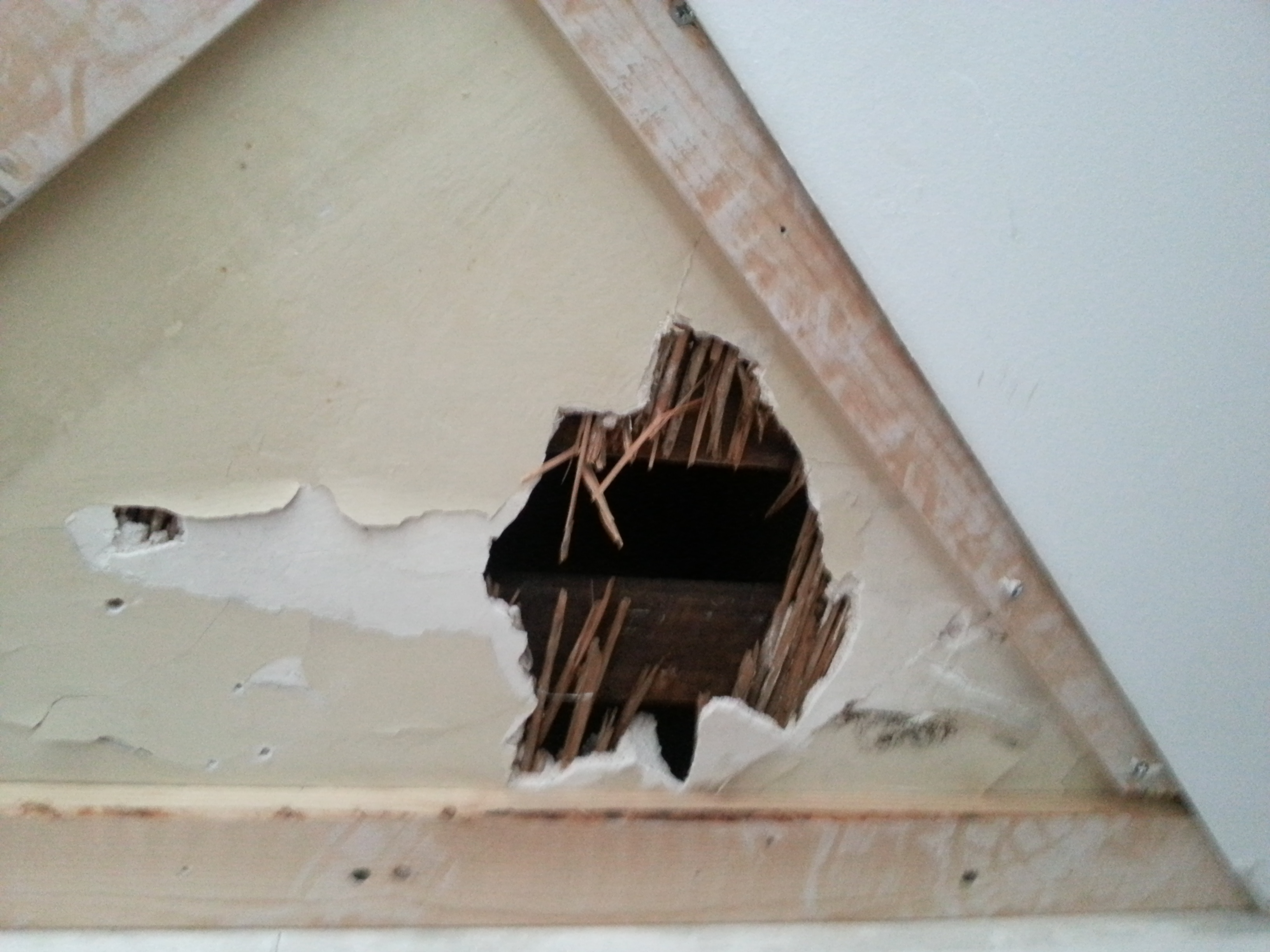 Zoals op de foto te zien is, bestaat het huidige plafond uit rachels met daarop een bepleisterde rietlaag in slechte conditie. De vorige eigenaar heeft daar latjes op geschroefd en een enkele laag gipsplaten aangebracht.