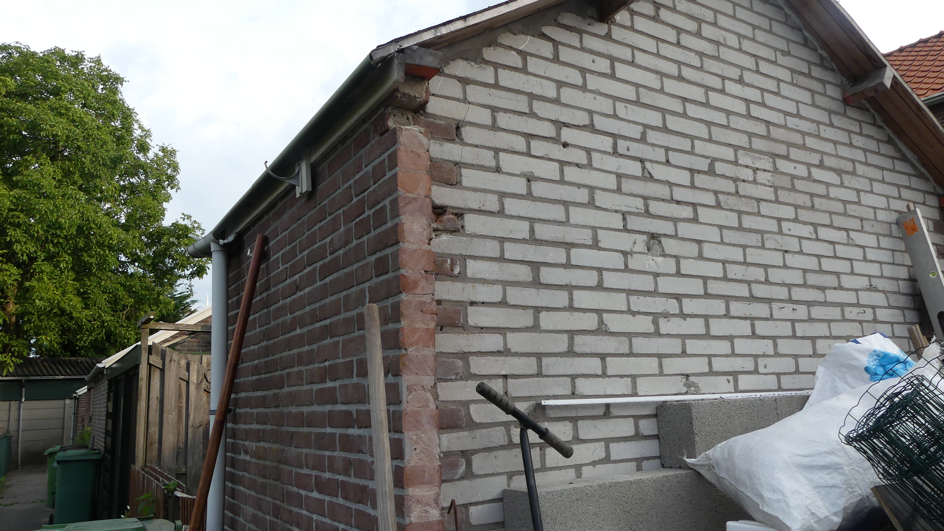 De gene die deze muur heeft verwijderd moet in ieder geval zorgen dat de water en vochtdichtheid gehandhaafd blijft als voordat deze muur werd verwijderd. Meestal op te lossen door er een nieuw buitenblad er voor te plaatsen in een gevelsteen. Ook moet de dakrand correct worden afgewerkt. Nu kan de bebording door vocht gaan verrotten.