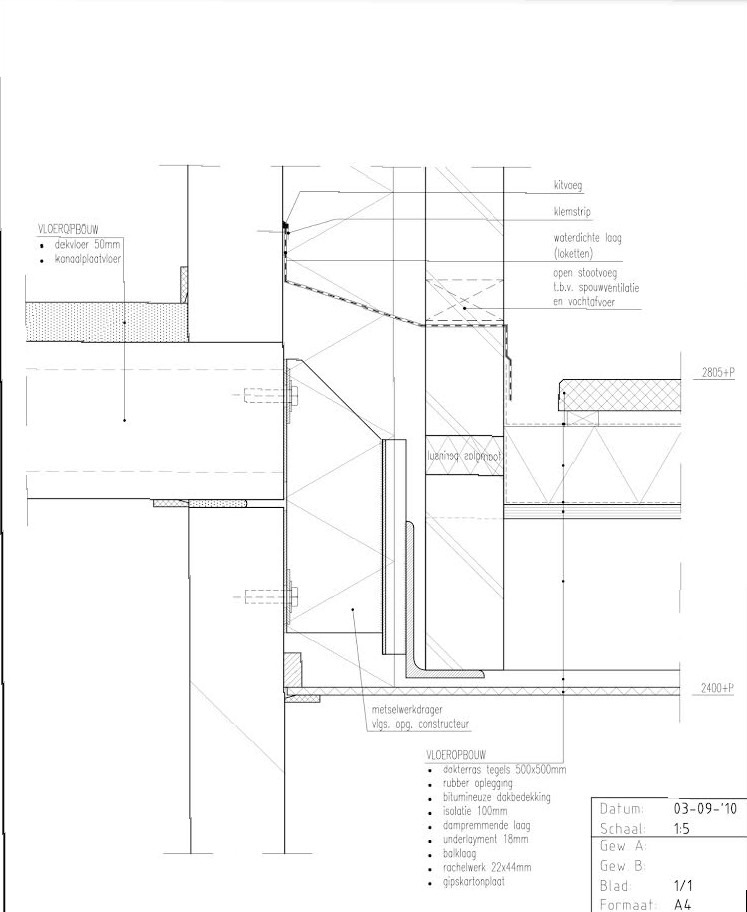 Op het gebied van thermische isolatie wel wat aandachtspunten; ik denk niet dat je met 100mm isolatie een Rc=6 voor het dak kunt realiseren. Verder staat de spouw van het opgaand metselwerk in open verbinding met de platdak aansluiting eronder; hierdoor koudebrug en kans op vochtproblemen door condensvorming.
