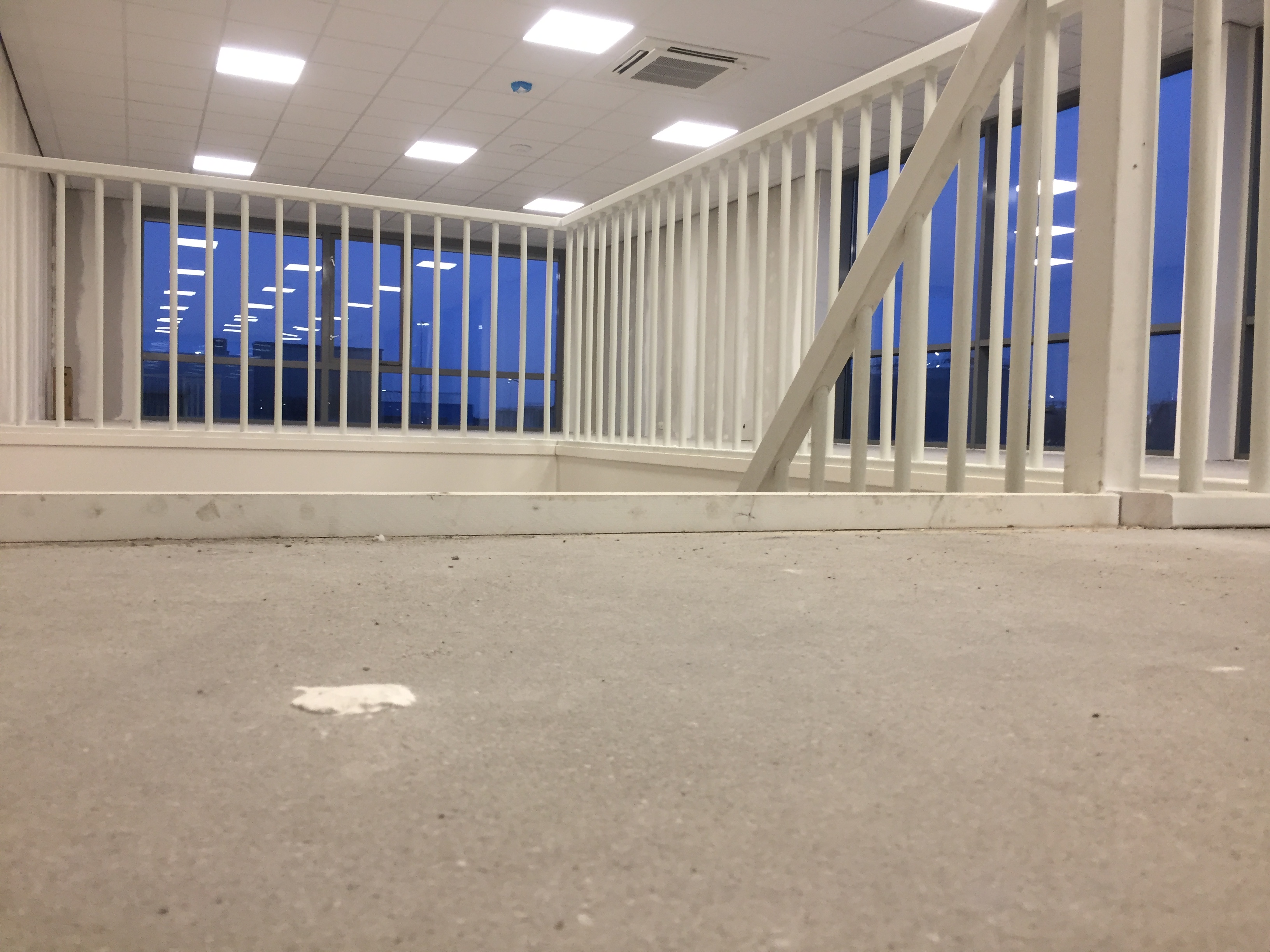 Je ziet op de foto nog net de onderkant van de weltrede, ik verwacht dat het om zo'n 4 cm hoogteverschil gaat. Leuk als er nog een massieve eiken vloer gelegd gaat worden, maar dat lijkt me bij een kantoor weinig aannemelijk. Waarschijnlijk kom je hier uit op iets als laagpolig tapijt of iets als PVC. Dan zit je op hooguit een centimeter dikte, mogelijk minder. Die trap is gewoon te hoog geplaatst en/of de afwerkvloer is te dun aangebracht.