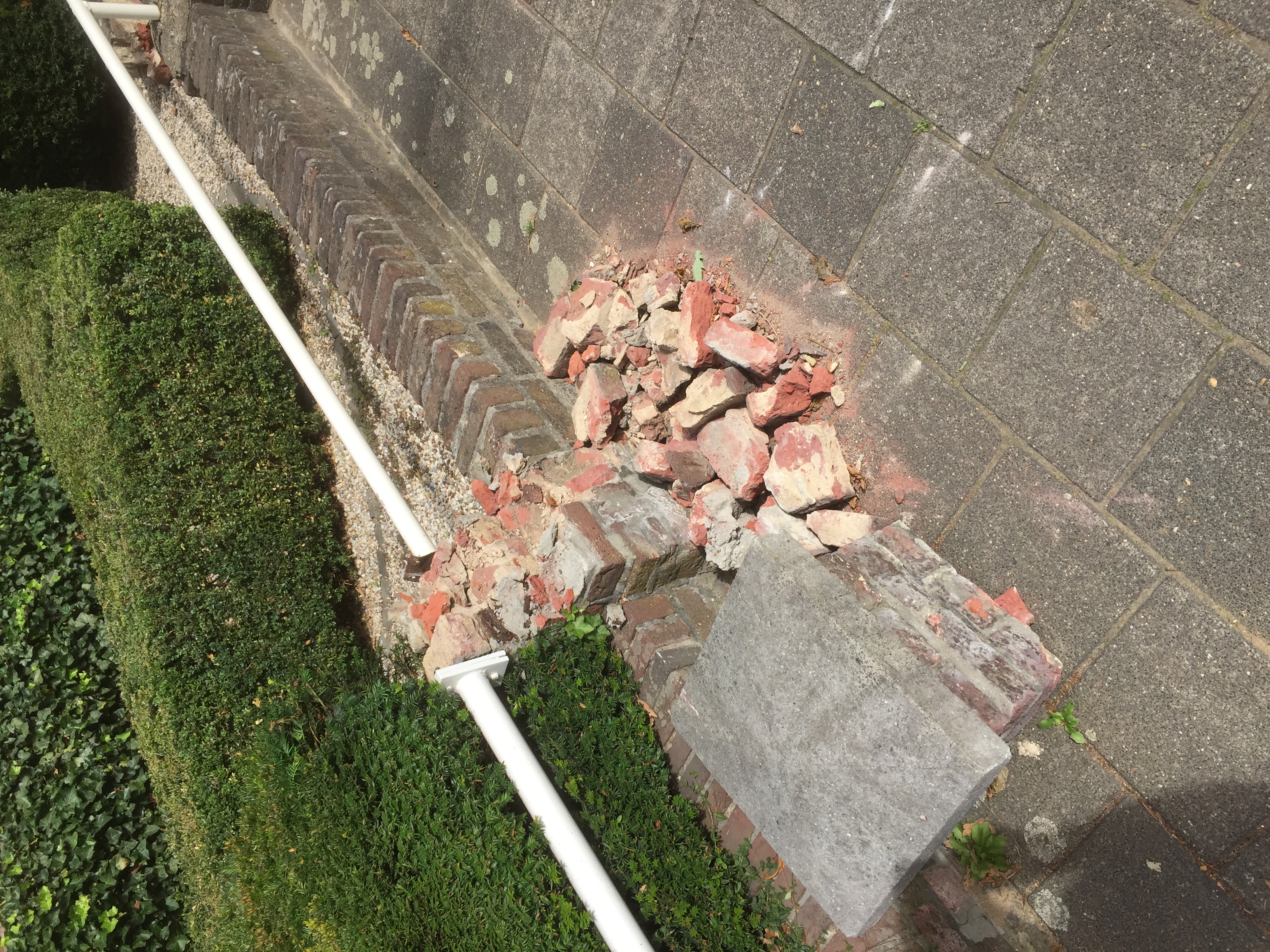 Doordat een auto onze voortuin muur volledig heeft vernield en ook 3/4 van midden penant, is het muurtje met de midden penant afgebroken en alle oude kapotte stenen door aannemer weggehaald. Buurman heeft tijdens zijn vacantie geen toestemming gegeven om op zijn grond iets te doen. Penant zijn helft kon dus niet weggehaald worden totdat buurman terug was van vacantie. Verzekering heeft schade van onze muur vergoed. Buurman heeft ook schade en claimt dit bij eigen verzekering. Tijdens opruimen van muurtje/ kapotte stenen, heeft buurman toestemming gegeven om de midden penant, zijn helft ook weg te halen.
