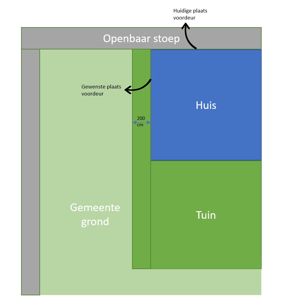Ik woon op een hoekhuis en ik wil mijn voordeur verplaatsen naar de zijgevel van de woning. Een 'strook' van 2 meter breed die evenwijdig langs de zijkant van mijn woning loopt is ook mijn eigendom. De strook grenst weer aan gemeentegrond.
