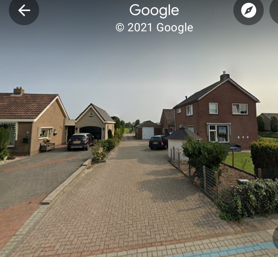 Zijn voordeur is bij de blauwe auto.en dan heeft hij nog 2 schuurtjes voor dat onze woning begint. Waar wij nu wonen was vroeger de koeienschuur van de voorste woning.