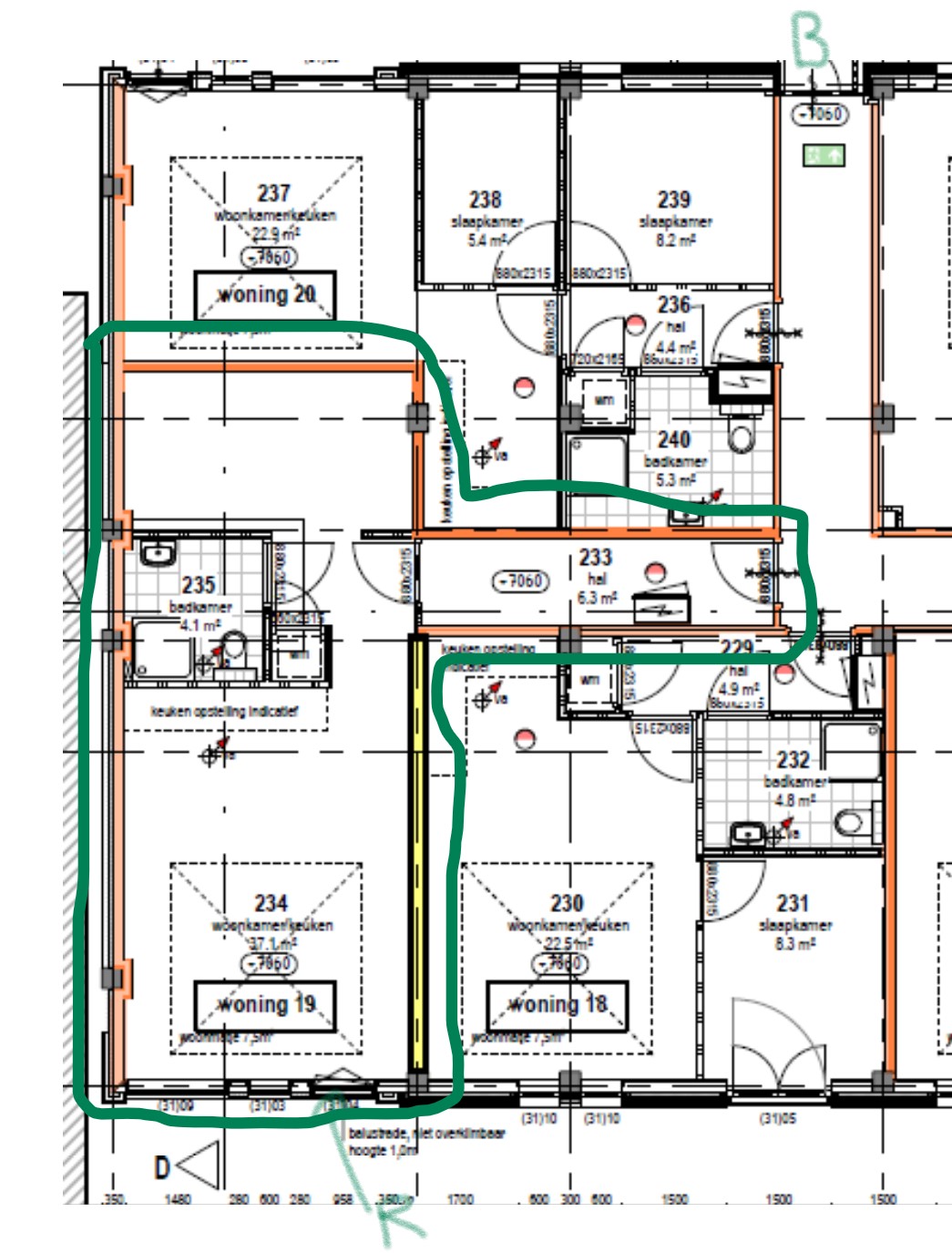 Mijn dochter woont sinds kort in een oud kantoorpand dat dit jaar is verbouwd tot appartementencomplex. Zij is de eerste bewoner van haar studio. De studio bestaat uit een woonkamer met open keuken, een badkamer en een 'slaapkamer' die officieel niet zo heet. In dit deel van de studio zitten geen ramen, en volgens de verhuurder mocht er daarom geen aparte verblijfsruimte van worden gemaakt. Er is dan ook geen deur, maar een brede open doorgang naar de woonkamer. Zo is er eigenlijk één woon-slaapkamer die wordt onderbroken door het keuken-/badkamerblok (zie bijgevoegde bouwtekening - de woning is groen omcirkeld, B=brandtrap, R=raam). De woning heeft achter de voordeur een lange gang, die aansluit op de gemeenschappelijke gang. Links om de hoek naast de voordeur is, op enkele meters afstand, een buitendeur naar de brandtrap. In de woonkamer, helemaal aan de andere kant t.o.v. de 'slaapkamer' is één raam. Dit is een hoog raam, bijna een balkondeur, dat helemaal open kan, maar dat wel tot op enige hoogte is afgesloten met een glazen valbescherming, waardoor de opening naar buiten kleiner is geworden. Naast dit raam zitten nog 2 grote ramen die niet open kunnen. De ramen liggen op het zuiden en vangen bij zonnig weer de hele dag zon en warmte. Er is geen zonwering aan de buitenkant van het pand. Er is enige mechanische ventilatie aanwezig, maar niet veel.