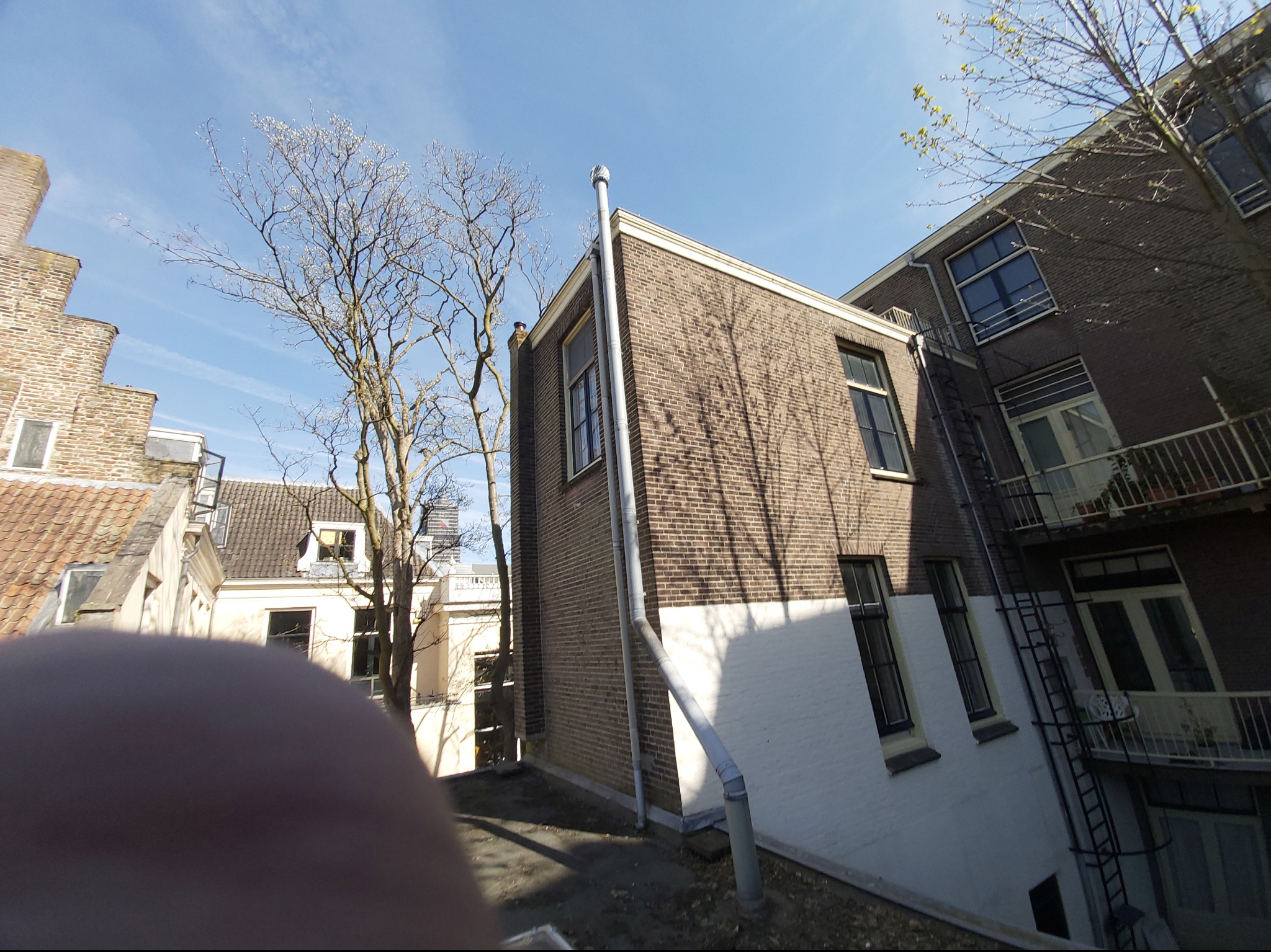 Vlak daarnaast zit een hoge muur (2 verdiepingen) van het buurpand. (Zie foto)
